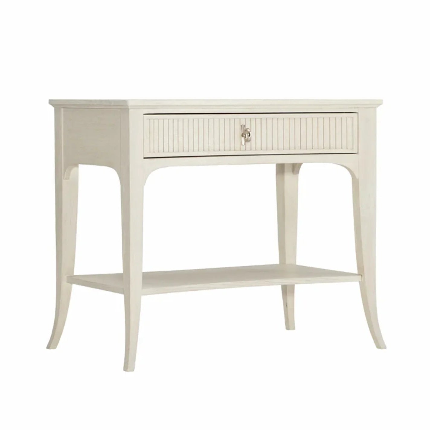 The Allure Nightstand exhibits the refined elegance of Italian-influenced design with its minimalist silhouette and luxurious materials. Designed with attention to sculptural detail, it features a single drawer accented by vertical beaded moulding and a jewel-like pull, set atop tapered legs for a graceful profile. The formal composition embraces a subdued palette of white and silver, offering timeless sophistication for bedrooms and high-end interiors.