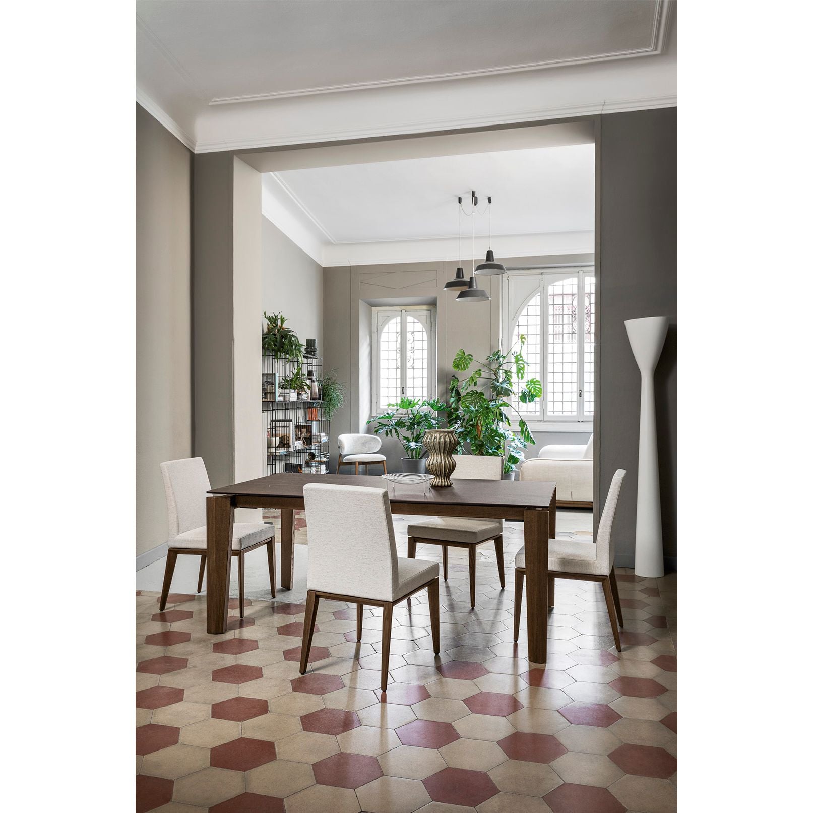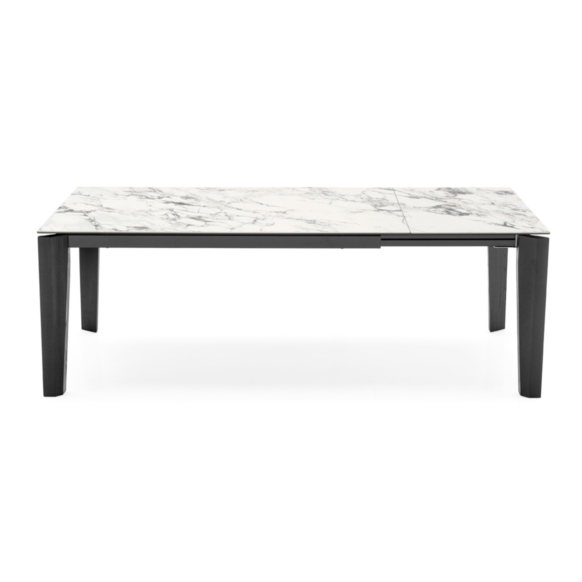 The Alpha extentension table is perfectly attuned to the idea of smart, elegant and versatile products that cater to all the normal "variables" of a lively home and make daily life simpler and more enjoyable. Its design is suited to all settings thanks to the combination of wooden legs and the choice among multiple ceramic tops. Moreover, the slightly tapered multi-faceted outer legs ensure the utmost comfort for guests seating at the table. The extensions are mounted on a frame with a guided opening movement.