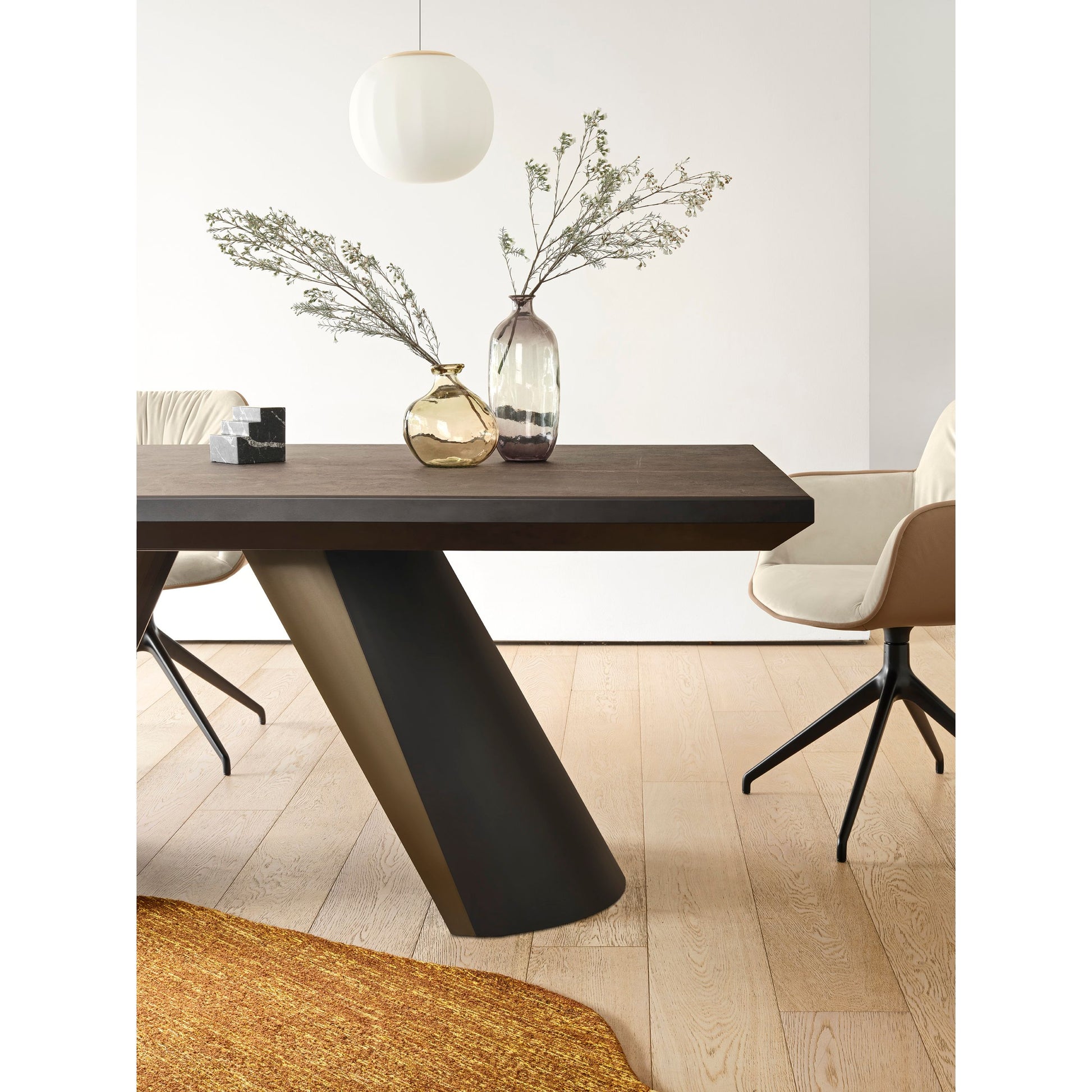 The airiness of the Apian extension dining table is reminiscent of a curved and inclined metal sheet, creating a base with a bold and sharp shape that culminates in a top equipped with a patented mechanism allowing it to be extended to up to 3 metres in length. The edge of the top echoes the shade of the base which has been detailed with coated double-sheet metal that gleams and catches the light, illuminating an area that would otherwise be left in the dark. Apian is one of those unexpected pieces that will instantly turn around an interior design project.