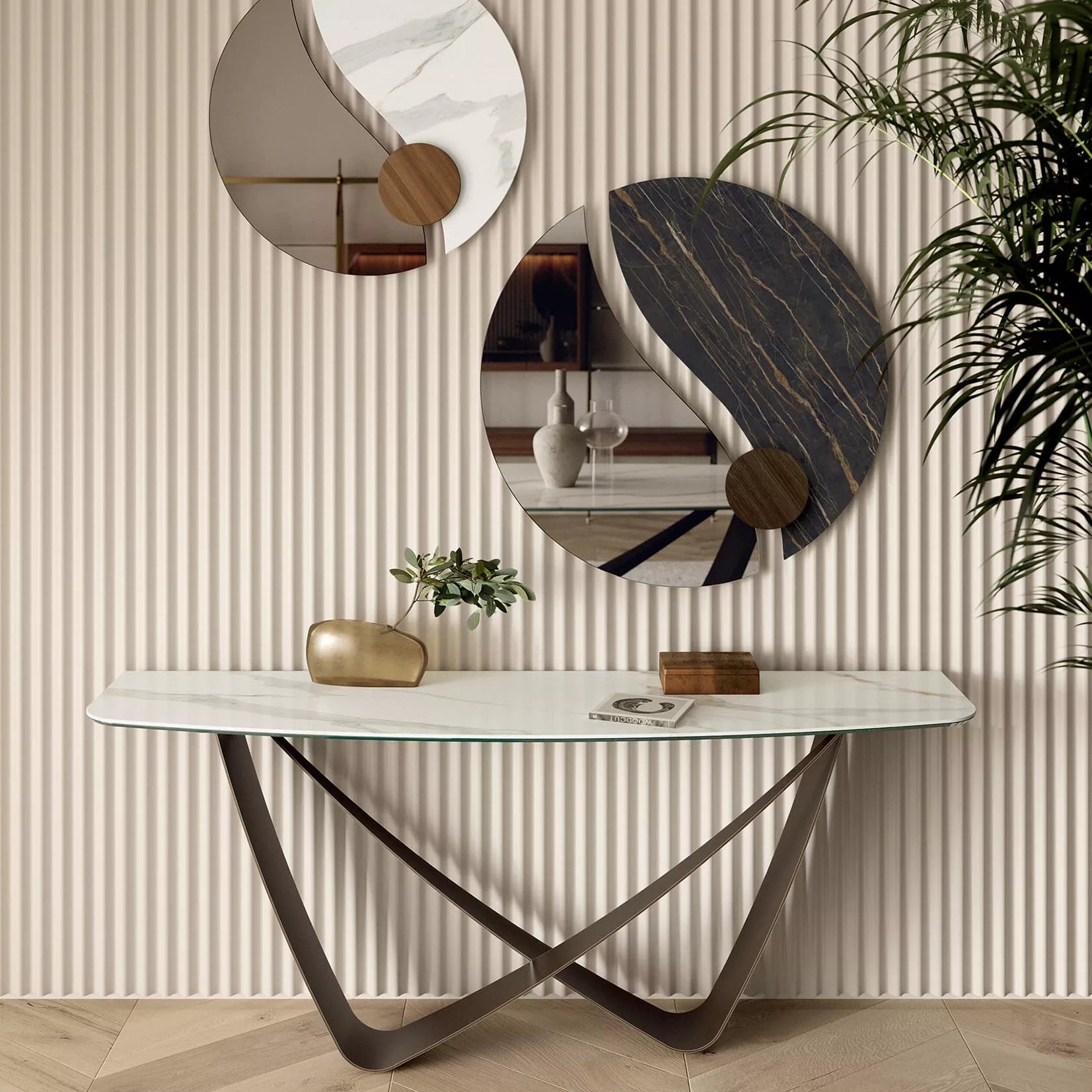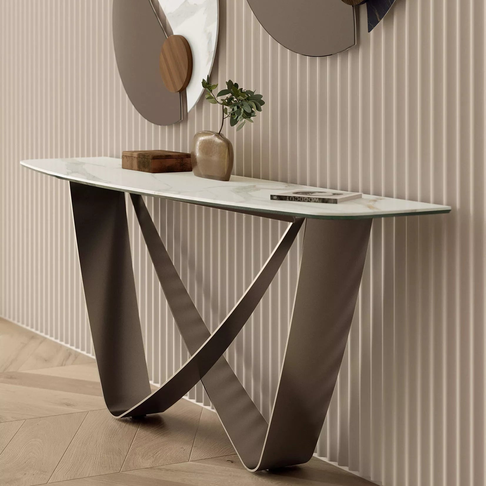 The Bach Console Table is defined by its clean lines and elegant form: two softly moulded vertical supports intersect to create a sculptural base, complemented by a top in wood or SuperMarble for refined contrast. Its understated yet graceful design brings a classical touch to modern interiors and harmonises beautifully with matching pieces from the Bach collection. Wall fixing is recommended.