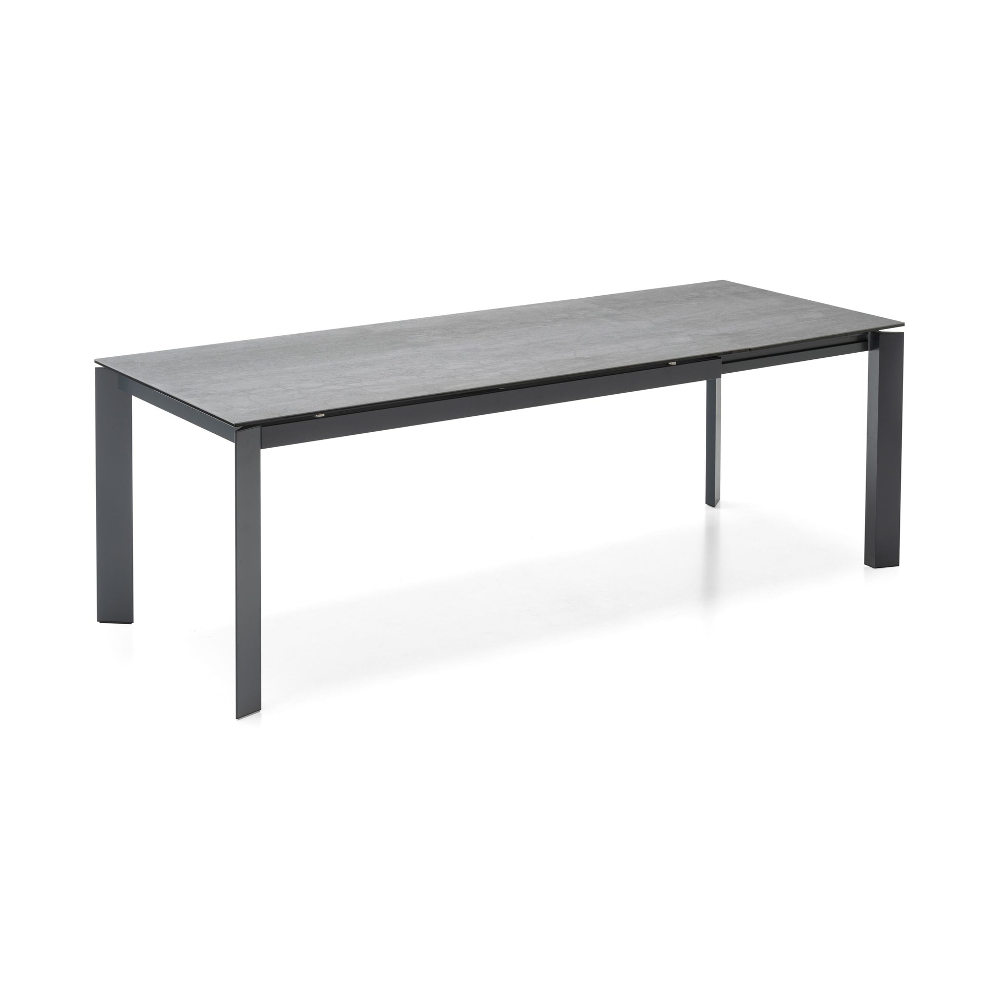 The Baron extension dining table contains a handy mechanism able to increase the top surface. Pull the frame towards you so that the two legs with hidden castors slide on one side allowing the leaf to be pulled out. With a simple rotation the leaf fitted on metal tracks comes out of its housing and lines up with the top. The legs stay at the perimeter, ensuring maximum comfort for all guests.