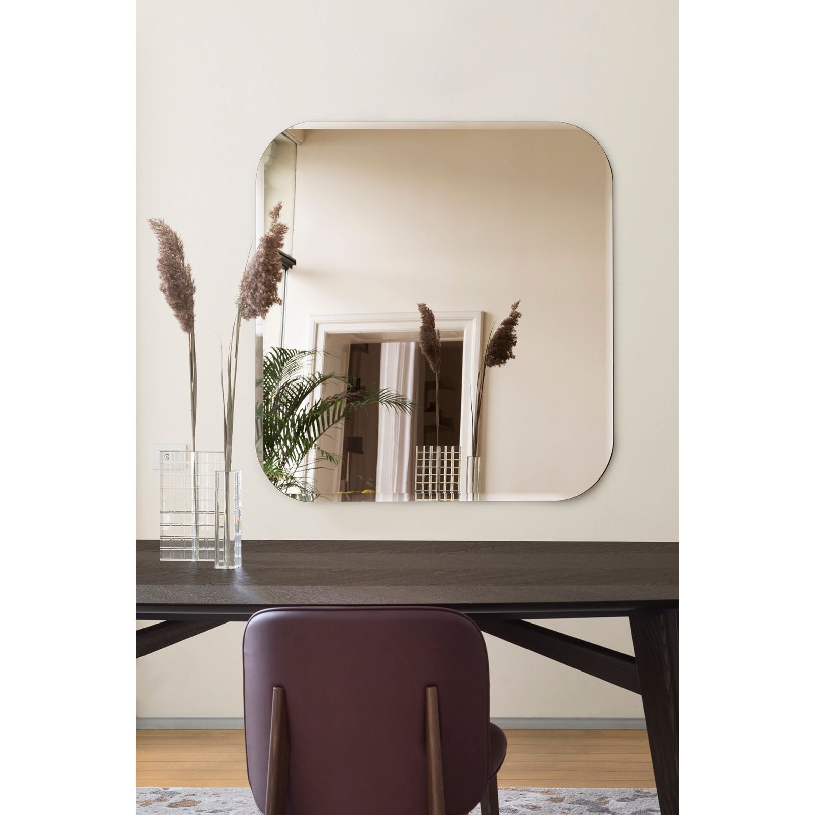 The Bevel Square Mirror offers a refined geometric presence, defined by its crisp silhouette and delicately bevelled edges that enhance light and depth. Its perfectly balanced square form makes it an elegant focal point for living rooms, bedrooms or entryways, adding clarity and visual symmetry to contemporary interiors. With its clean detailing and understated sophistication, it elevates the reflective surface into a subtle design statement.