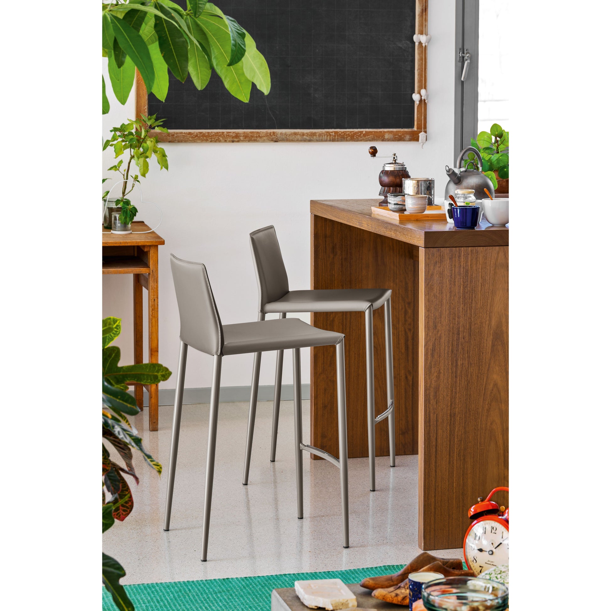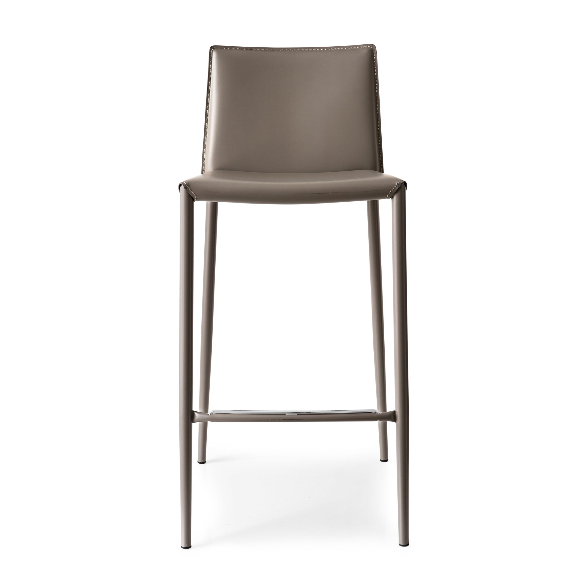 The Boheme Stool features an elegantly contoured padded shell upholstered in regenerated leather with exposed stitching, paired with slender conical tubular-steel legs in a matching finish. Sleek, refined and built for modern interiors, Boheme lends a sophisticated edge to kitchen islands, bars and dining spaces alike.