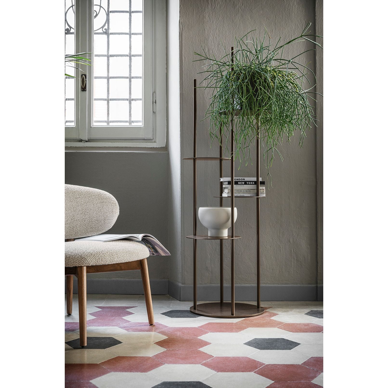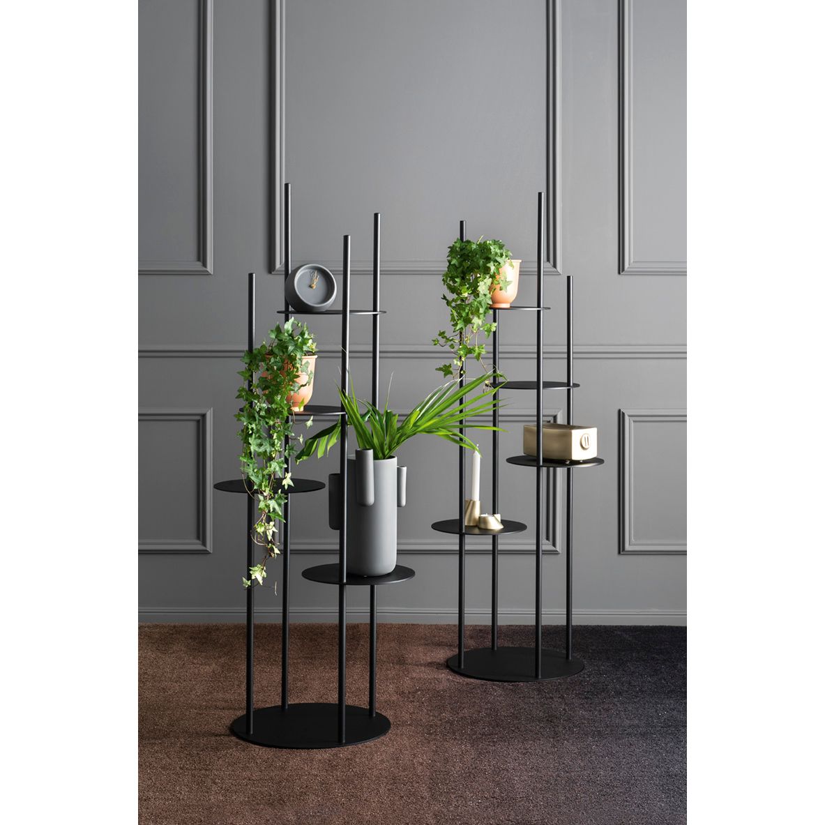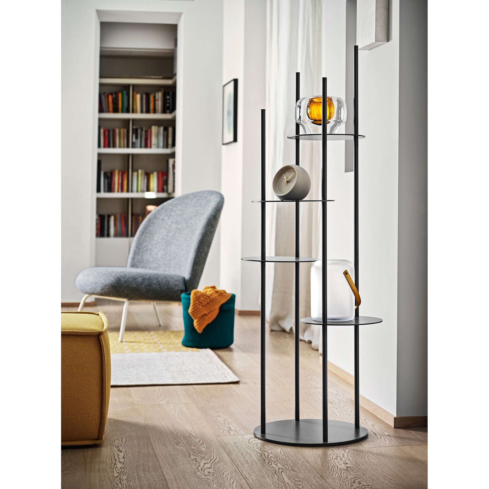 The Circles Stand is a striking vertical totem of functional design, crafted entirely from varnished metal and featuring four circular shelves at varying heights. Its narrow footprint and sculptural presence make it an ideal display piece for your most valued objects without dominating the space. With its architectural rhythm of rods and discs, Circles transforms shelving into a work of art.