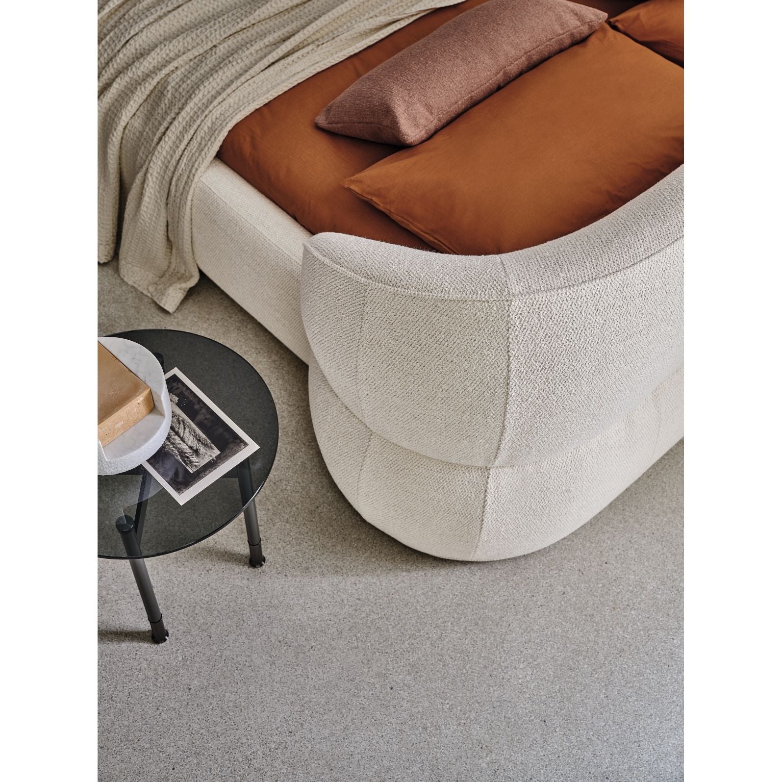 The Clip Bed is a dramatic expression of Italian design—its rotund, sculptural profile and gently curved headboard create a luxurious centrepiece that works beautifully in a room positioned away from the wall. Soft, rounded lines define its silhouette, delivering a bold yet elegant visual impact with refined upholstery and meticulous proportions.