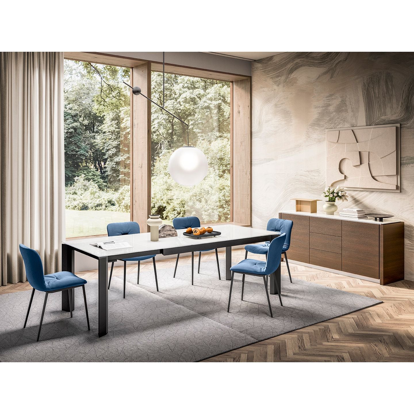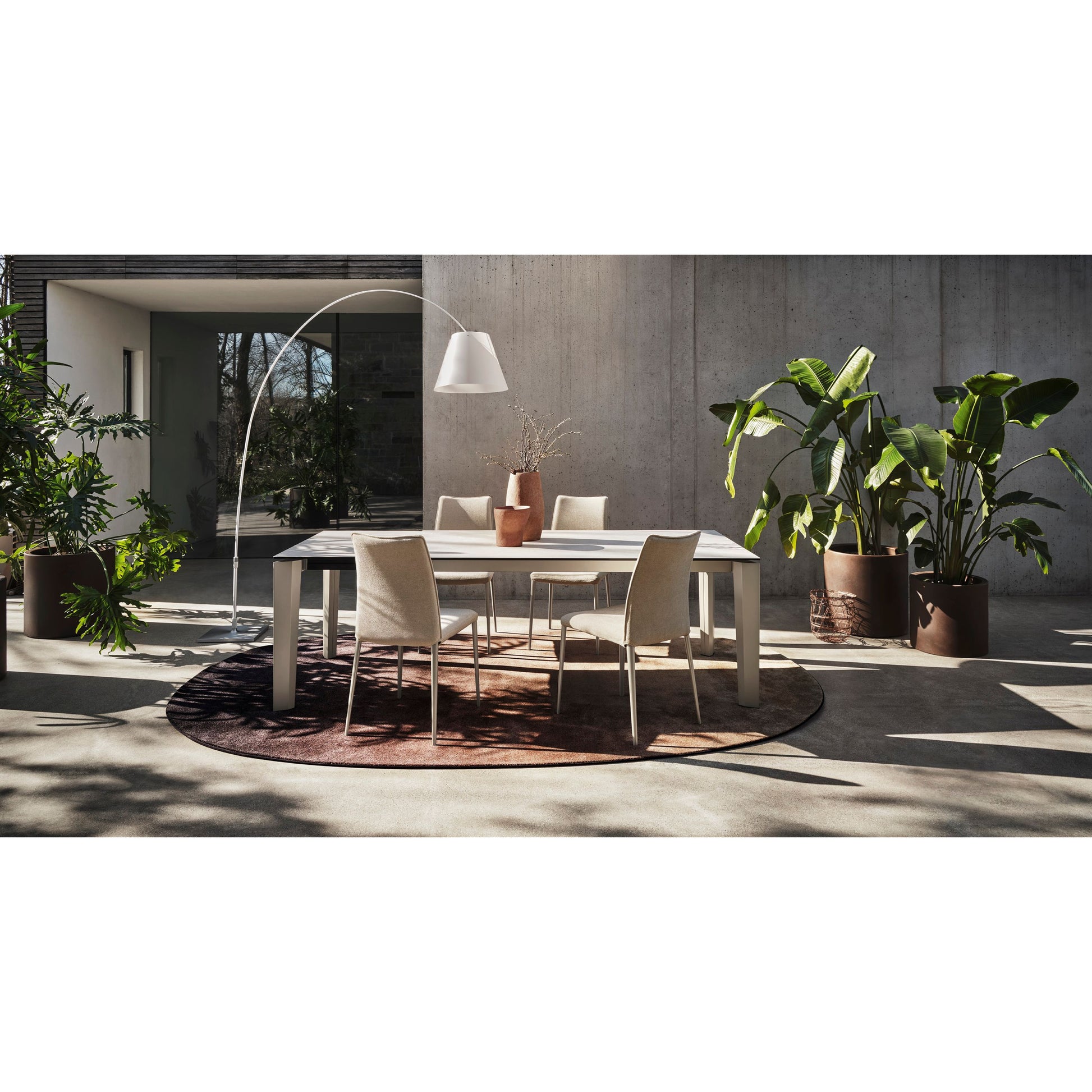 Delta is a versatile extension dining table with a top and matching extension available in a range of ceramic finishes. The frame features an assisted opening mechanism that allows the legs to remain at the corners of the table and can be customised in a variety of lacquered finishes.
