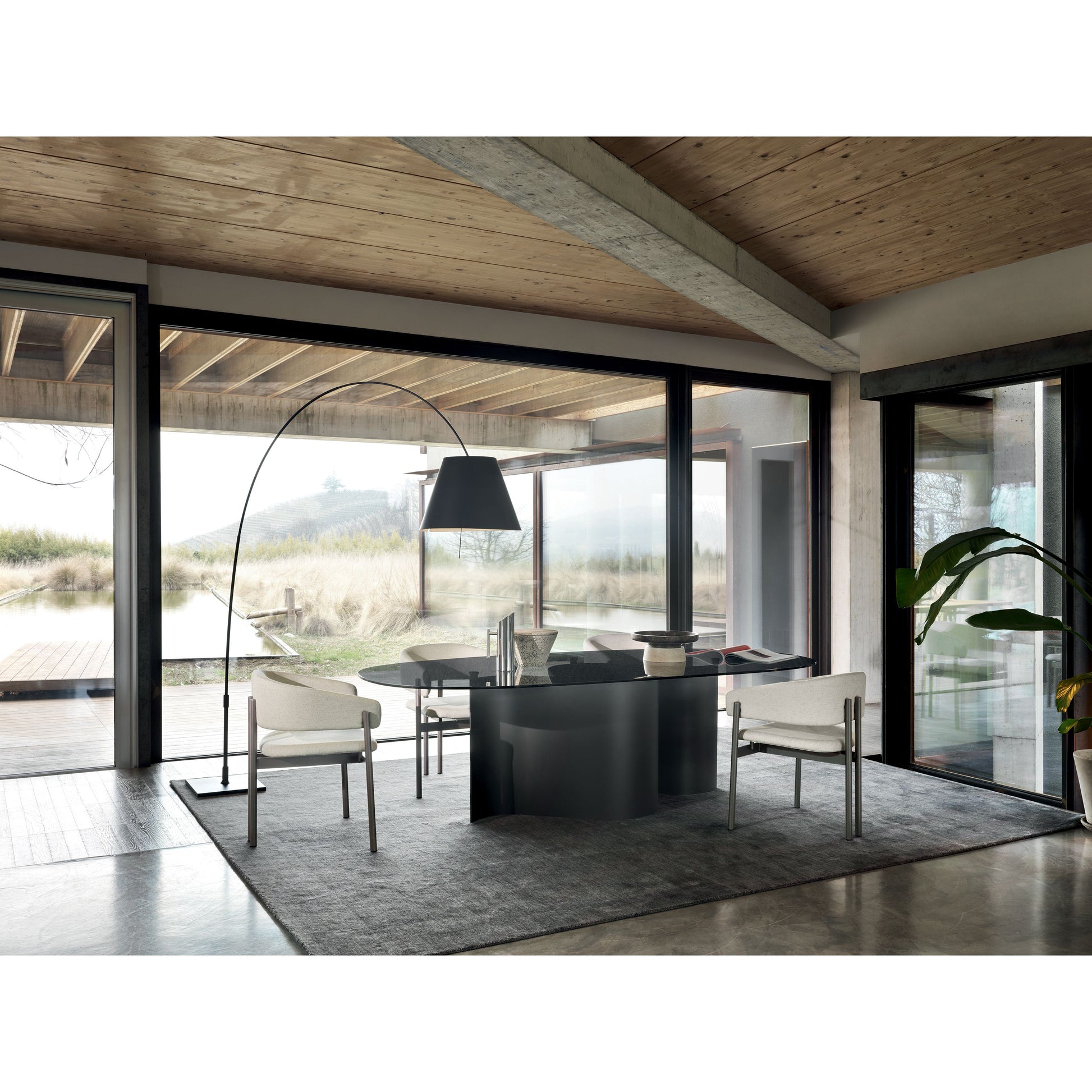 The Doon Dining Table embodies the essence of balance and elegance. It features an oval top available in either glass or marble, supported by two identical base elements in contrasting finishes that gently meet, creating a dynamic play of light, form and perspective. A sculptural centrepiece that brings harmony and sophistication to contemporary dining spaces.