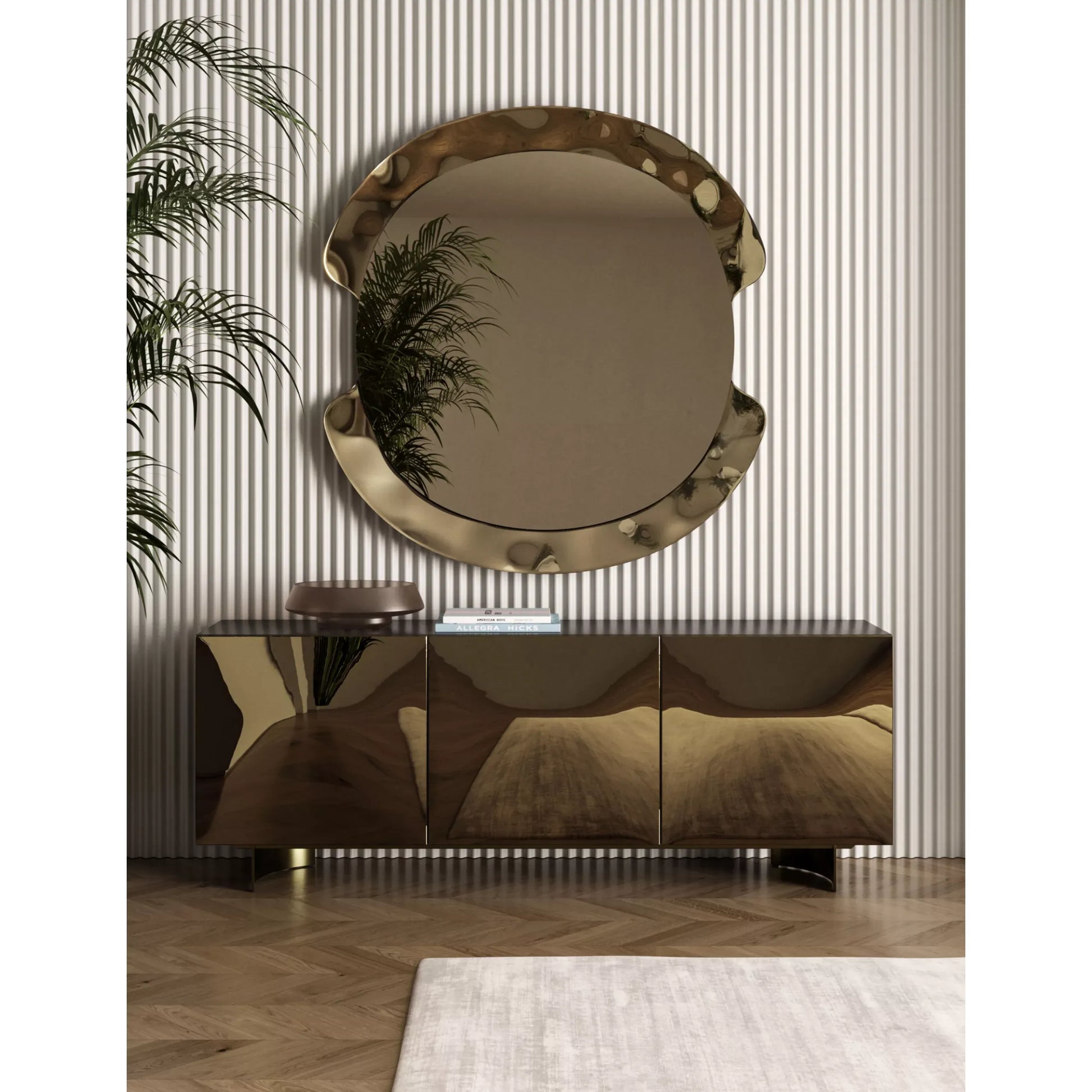 The Eden Sideboard delivers sculptural elegance with a sharp silhouette and captivating play of light and shadow on its mirrored-glass doors. Inside, clear glass shelving adds transparency and refinement, while the lacquered wood body offers both visual richness and everyday practicality. With premium materials and architectural presence, Eden becomes a central feature in modern living and dining spaces.