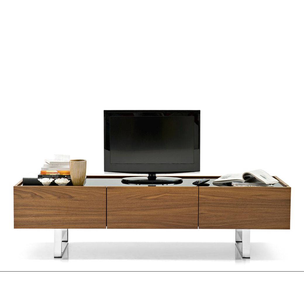 The Horizon Entertainment Cabinet features a sleek wood-frame design with generous storage—two side drawers and a central drop-down door create a clean, functional aesthetic for modern living spaces. The central compartment includes a glass shelf and cable-outlet to support media devices without sacrificing style. Elevated on a 21 cm high chrome-plated metal sled base, this piece aligns well with minimalist and refined interiors.