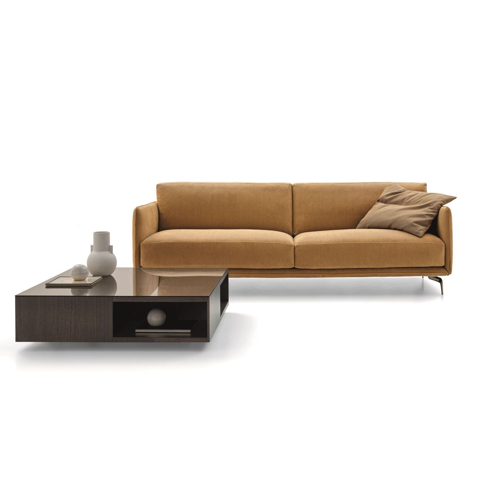 The Krisby Sofa is a modular Italian design system distinguished by its sleek metal-alloy feet with flowing lines and two removable armrests that define its character. Whether you choose the soft, feather-filled informal version or the more formal edition with boxed edges, Krisby adapts beautifully to a variety of interiors while retaining tailored sophistication.