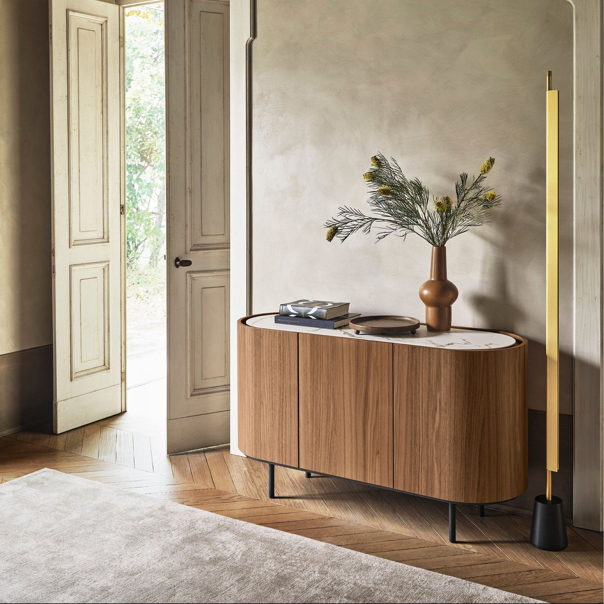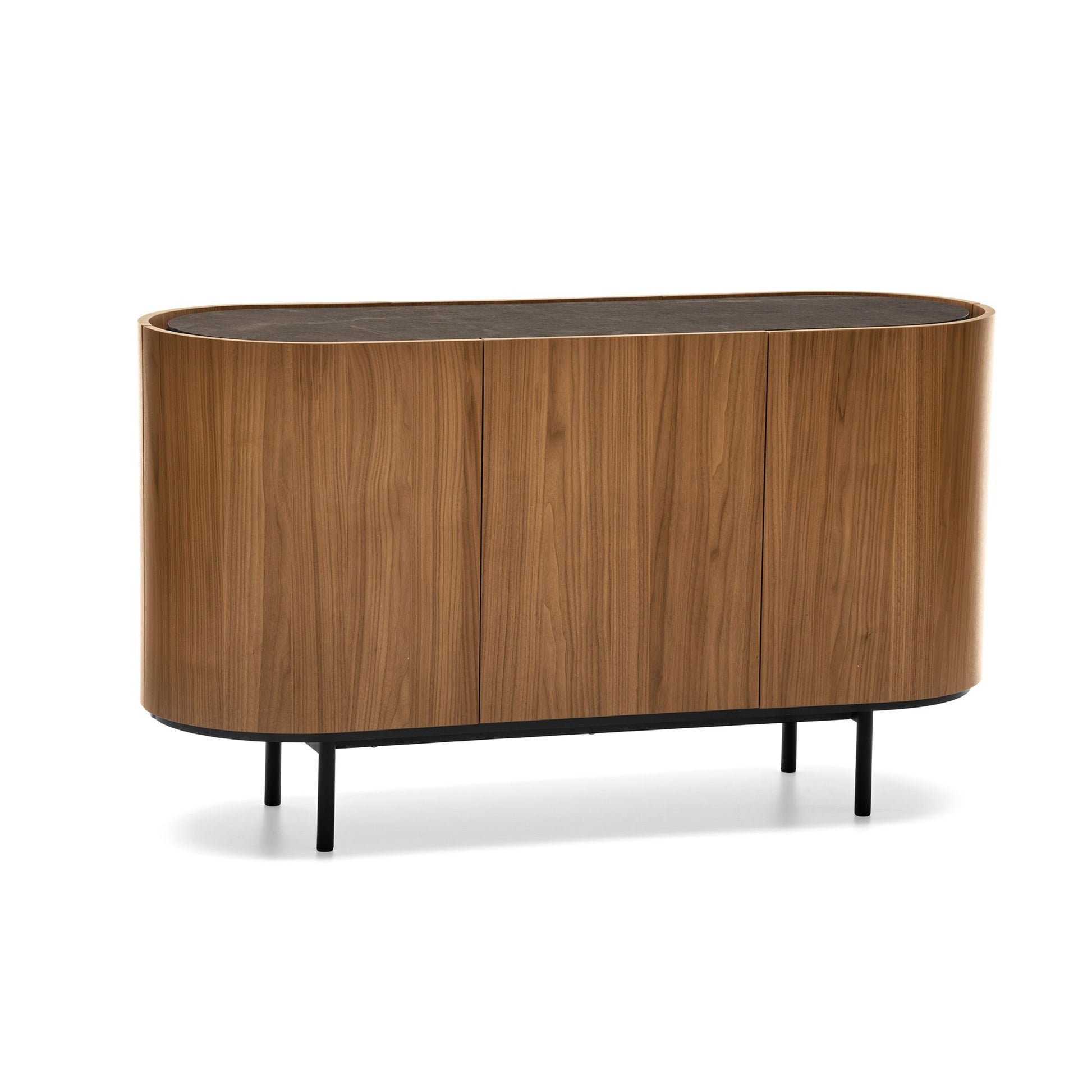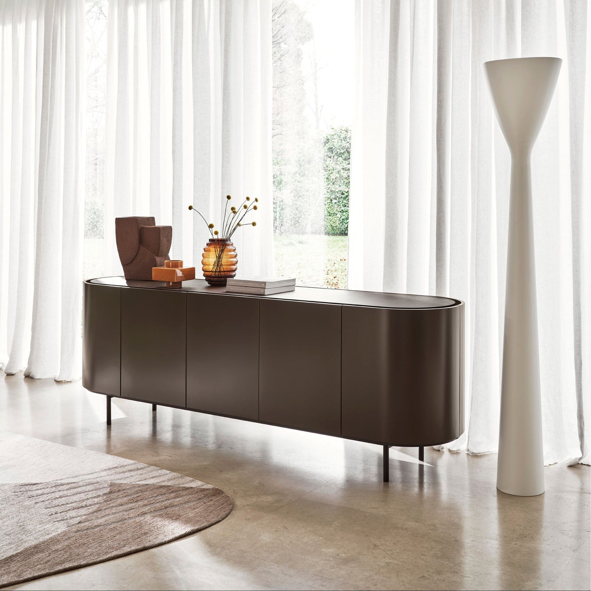 The Lake Buffet stands out for its sleek, harmonious lines and softly sculpted oval form, elevated on a raised base. Its slightly recessed ceramic top creates a practical space for opening doors and drawers without handles, while its fully veneered body shines from all angles. With refined proportions and understated elegance, the Lake Buffet brings contemporary sophistication to modern interiors.