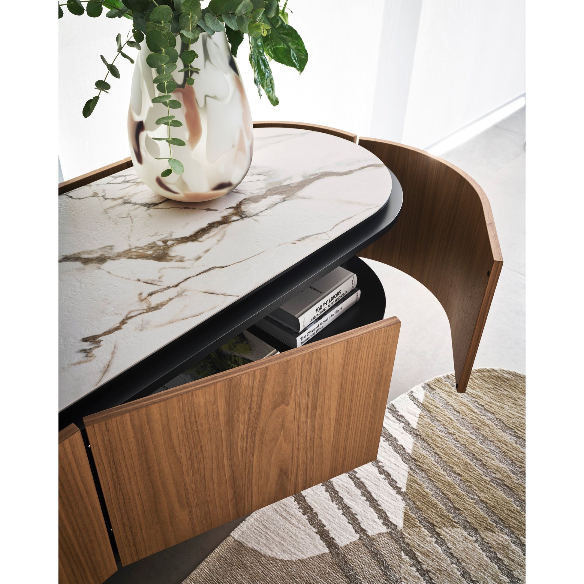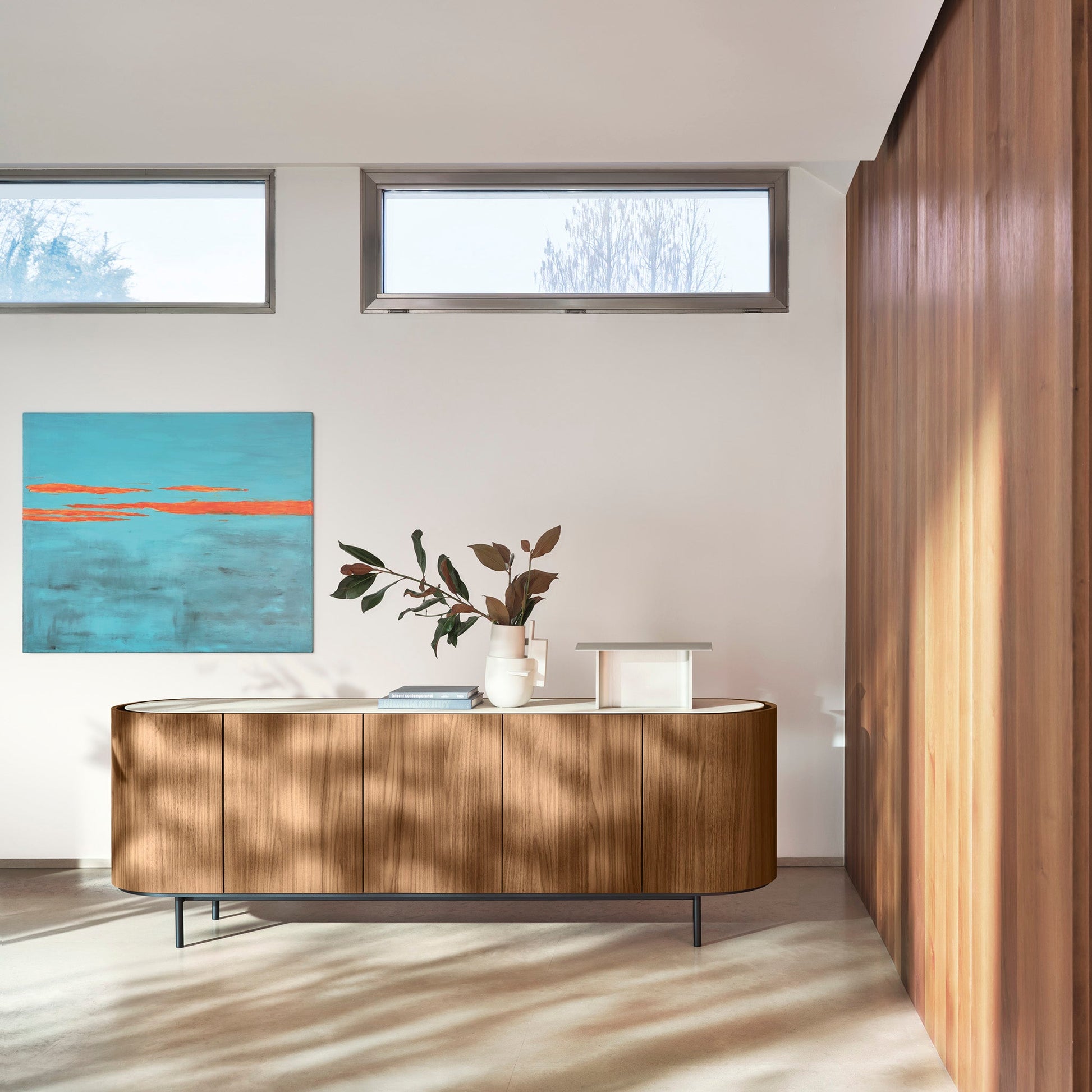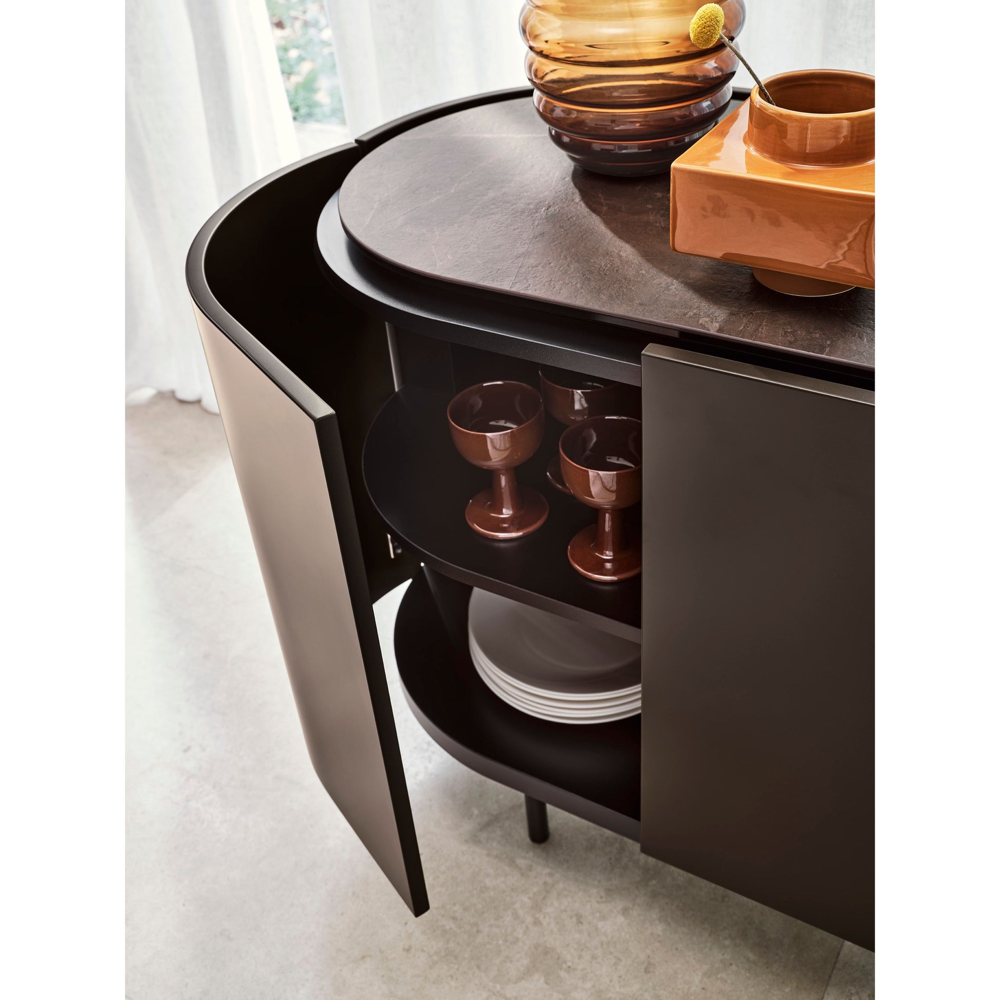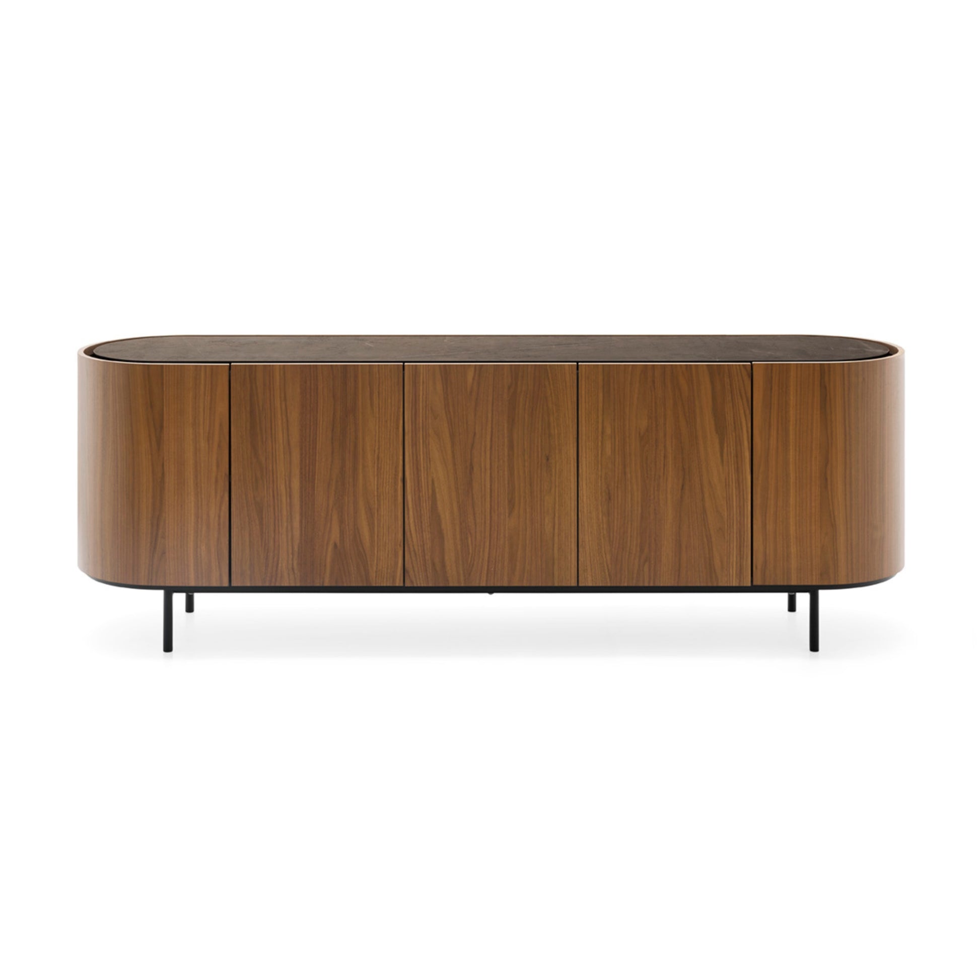 The Lake Buffet stands out for its sleek, harmonious lines and softly sculpted oval form, elevated on a raised base. Its slightly recessed ceramic top creates a practical space for opening doors and drawers without handles, while its fully veneered body shines from all angles. With refined proportions and understated elegance, the Lake Buffet brings contemporary sophistication to modern interiors.