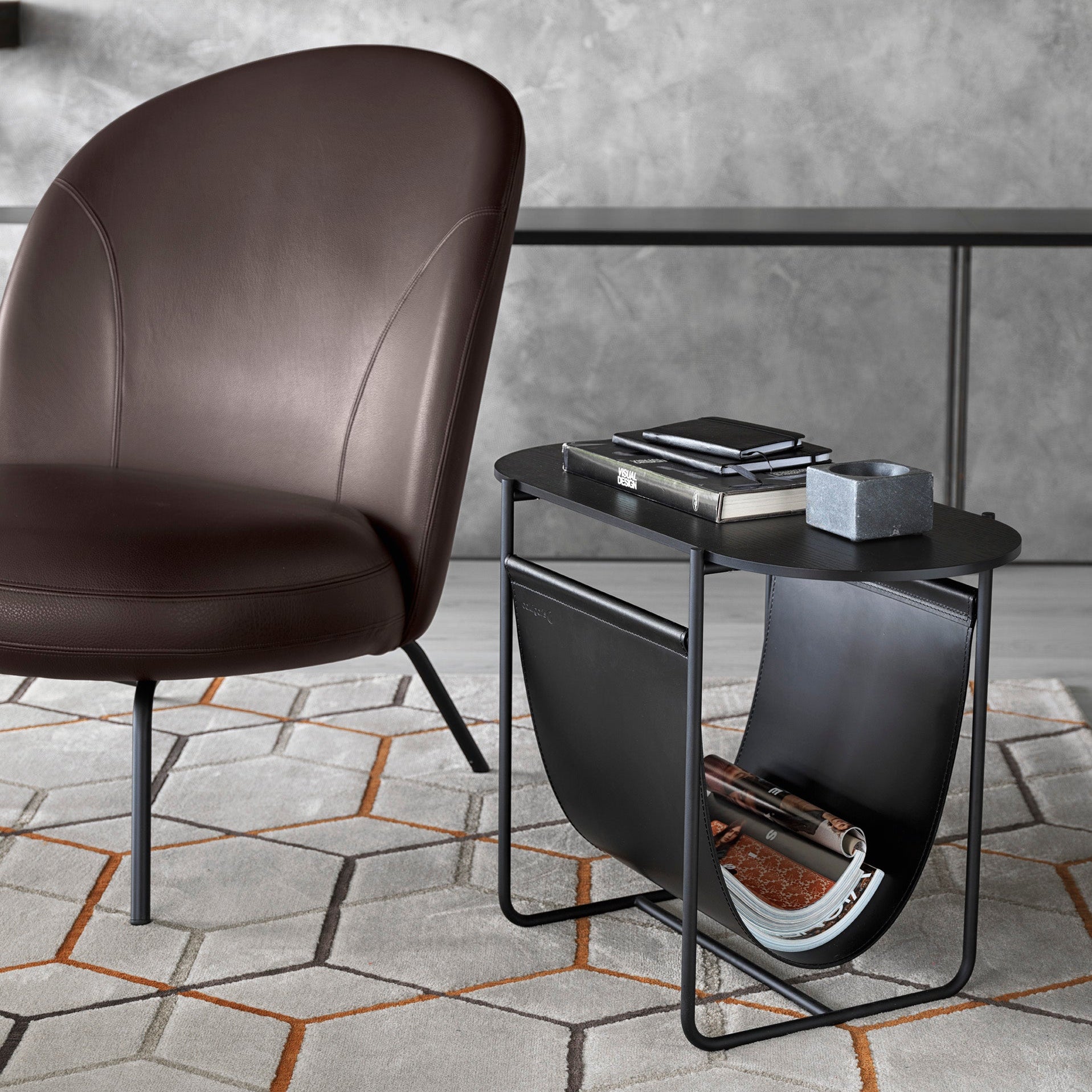 The Magazine Side Table blends contemporary design with everyday practicality. Its sleek metal frame supports an oval top, while a discreet regenerated-leather pocket beneath provides convenient storage for magazines or reading material without adding visual bulk. Compact, functional and design-forward, it’s an ideal companion beside a sofa, armchair or bedside in modern interiors.