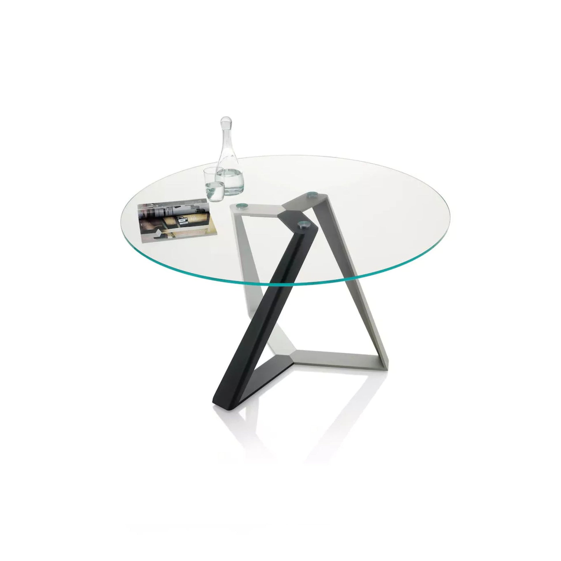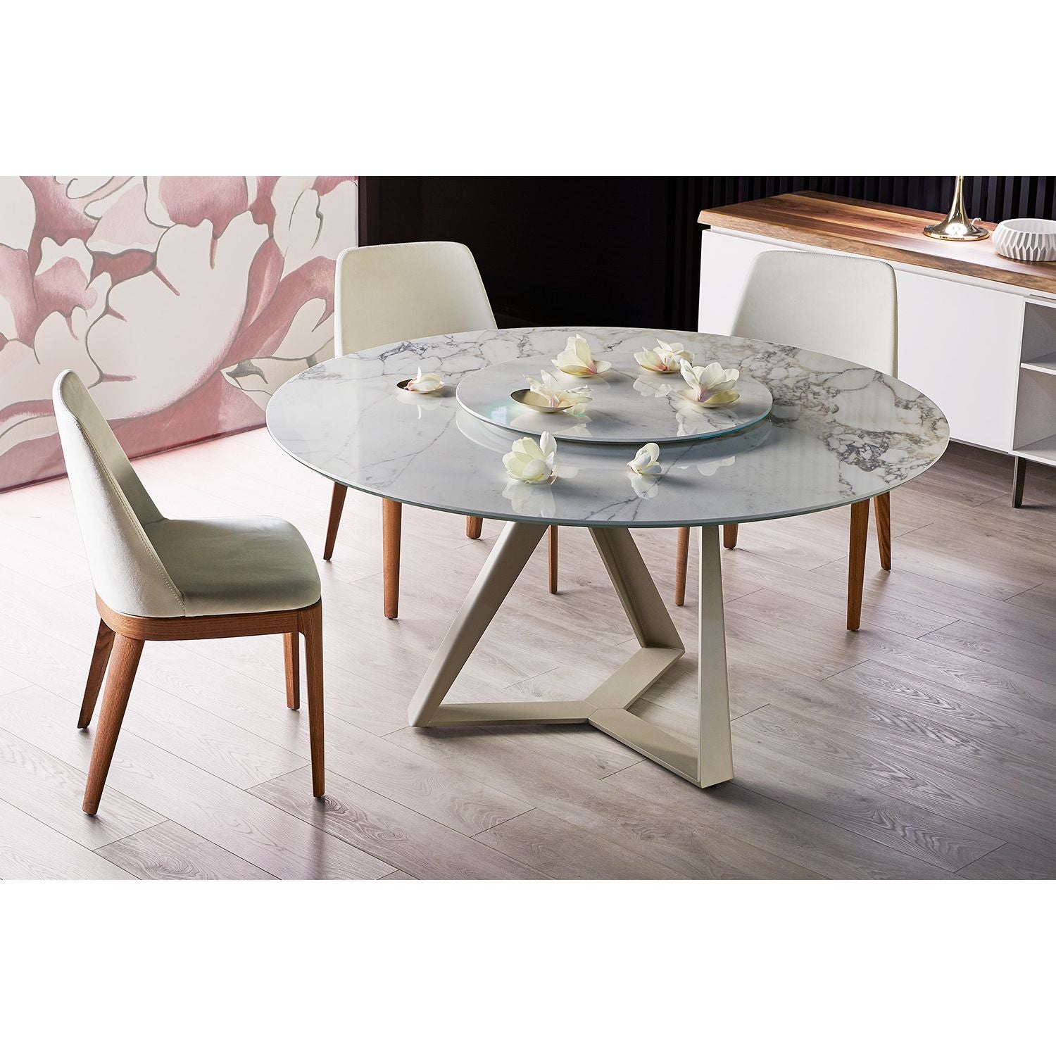 The Millennium Round Dining Table embodies sculptural elegance with its distinctive crossed metal base, where intersecting lines create a dynamic, architectural presence. The round top is available in a range of refined finishes including solid or veneered wood, glass, Superceramic or Supermarble. The 150 cm diameter version can be customised with either a 70 cm Lazy Susan or an integrated swivel tray built into the table top, offering both practicality and striking contemporary style.