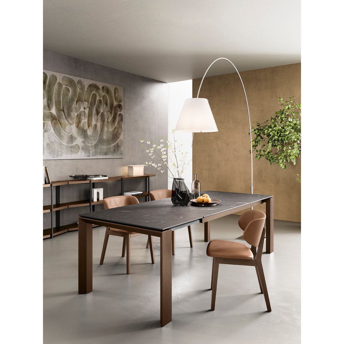 The Omnia table features an ingenious extension mechanism that combines practicality with contemporary design. Simply pull the frame toward you and the two legs—equipped with discreet castors—glide smoothly to one side, allowing the hidden leaf to be lifted, rotated, and perfectly aligned with the tabletop. The perimeter legs have a slanting cut on the inside, a distinctive detail that enhances the table’s refined aesthetic. With a selection of refined ceramic finishes for the top and a range of wood finishes for the frame, Omnia offers a harmonious balance of function and style for modern dining spaces.