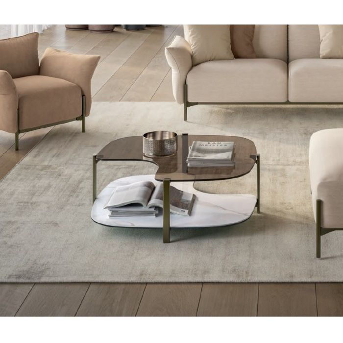 The Pagoda Coffee Table introduces architectural elegance into the lounge with its distinctive two-tier layered design and reverse-cut top edges, creating a sculptural silhouette. The upper surface is offered in glass, while the lower shelf can be selected in glass or ceramic marbles to deliver compelling contrast and visual depth. With a lacquered metal frame available in multiple finishes, Pagoda offers customised sophistication for modern living spaces.