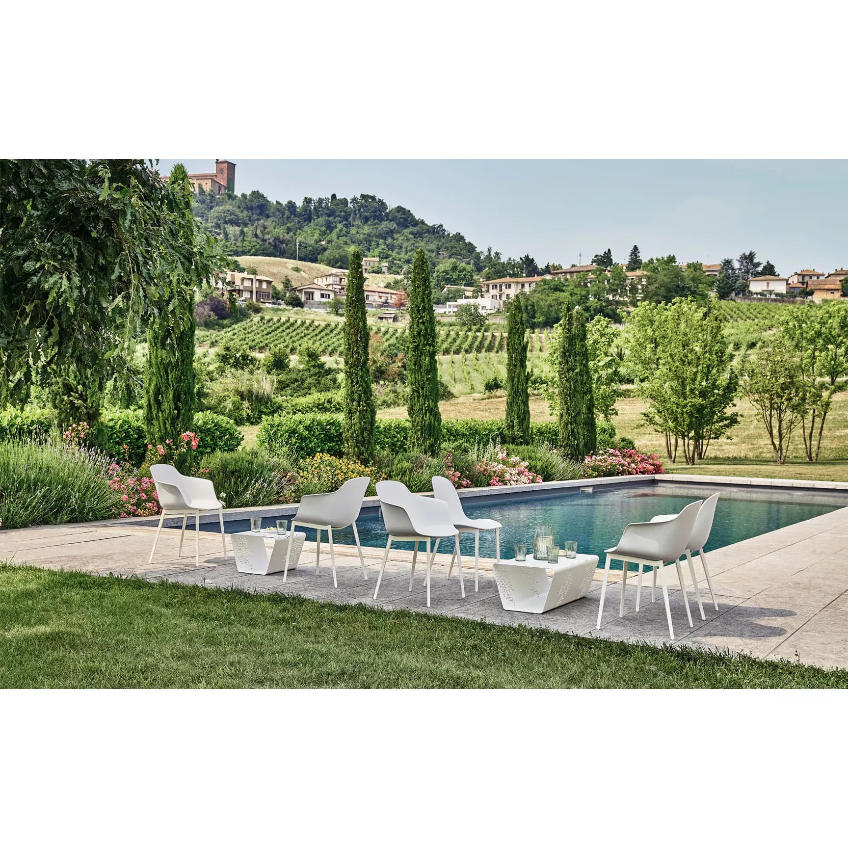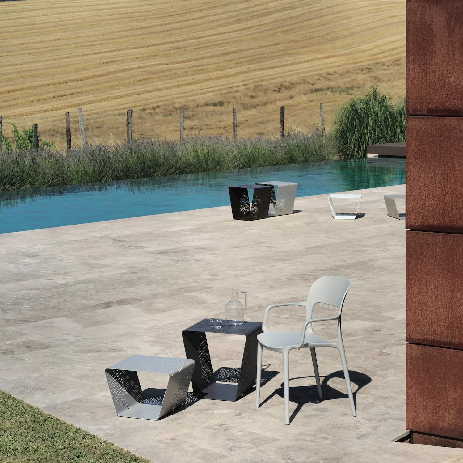 The Pattern Outdoor Side Table transforms outdoor spaces with its sculptural presence and functional versatility. Featuring a striking laser-cut pattern in the lacquered-steel frame, it serves as a side table, ottoman or magazine rack—ideal for terraces, poolside lounges or shaded garden settings. The intricate perforated metalwork creates lightness and texture while remaining robust and weather-resistant.