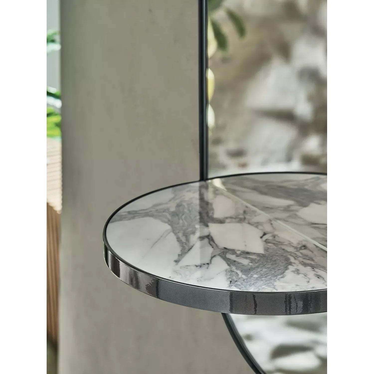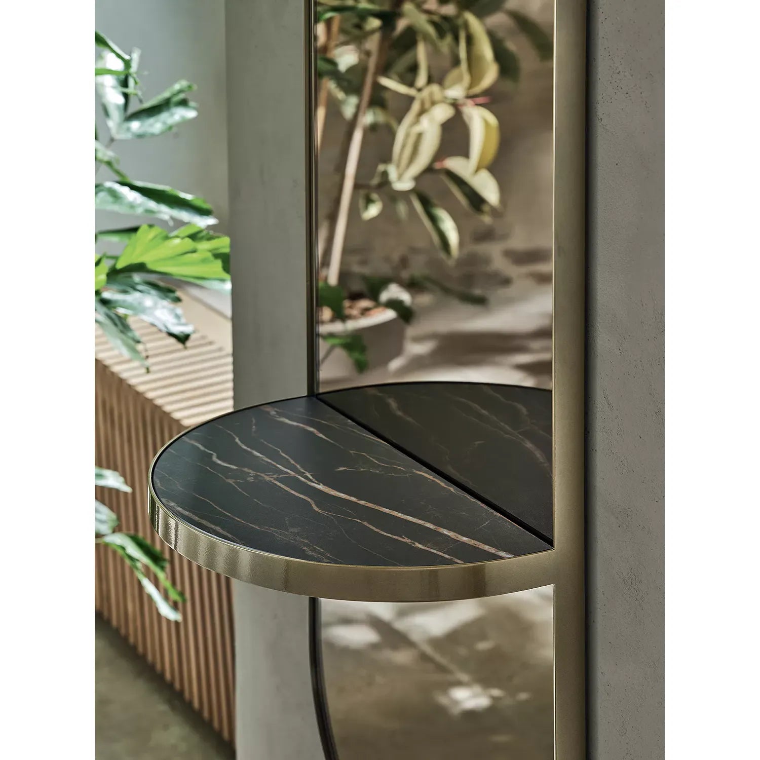 The frame is available in a selection of lacquered-metal finishes, while the shelf top is offered in mirrored glass or SuperMarble.