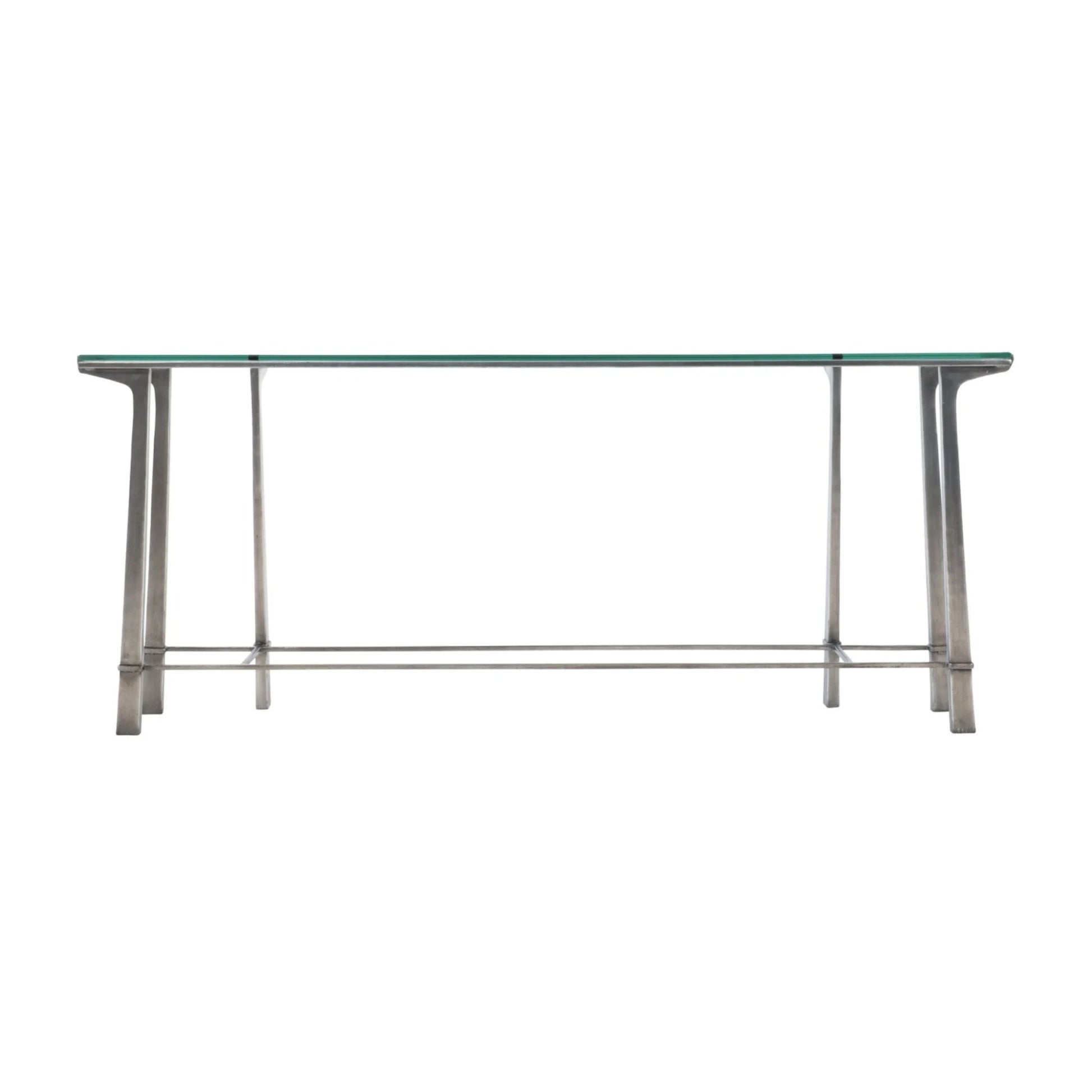The Telford Console Table offers a beautifully balanced combination of modern sophistication and refined detail. A sleek tubular steel base in a hand-applied silver leaf finish provides visual lightness, while the thick tempered glass top with polished edge gives the piece a sense of floating elegance. Ideal for an entryway, behind a sofa or along a hallway wall, this console table makes a subtle yet striking statement.